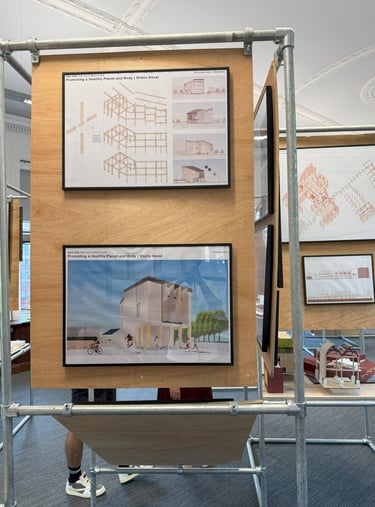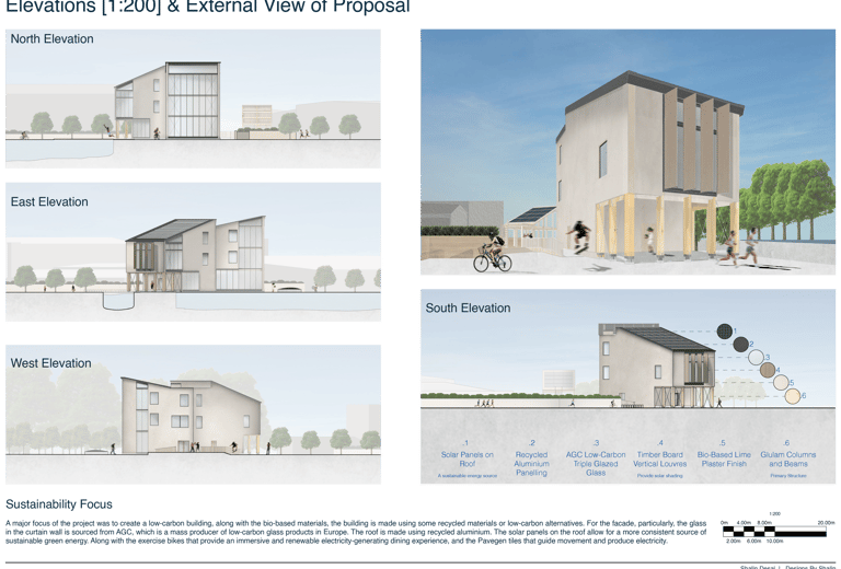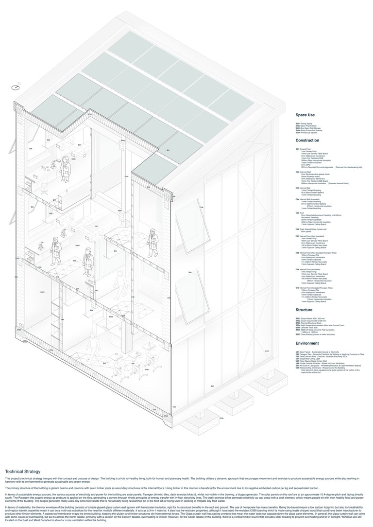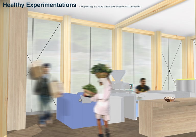 The site promotes wellness with exercise machines that generate renewable energy and offers an immersive dining experience. To support environmental health, sustainable materials like bio-based insulation and locally sourced timber are used in construction. By merging health innovation with eco-conscious practices, the project fosters a harmonious future for people and the planet.